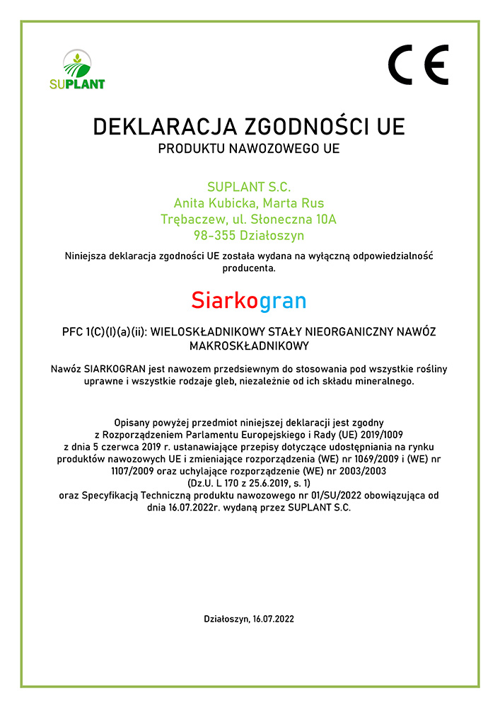 Siarkogran może być stosowany od wczesnej wiosny do późnej jesieni pod wszystkie uprawy tj. polowe, sadownicze, warzywnicze oraz na użytki zielone.