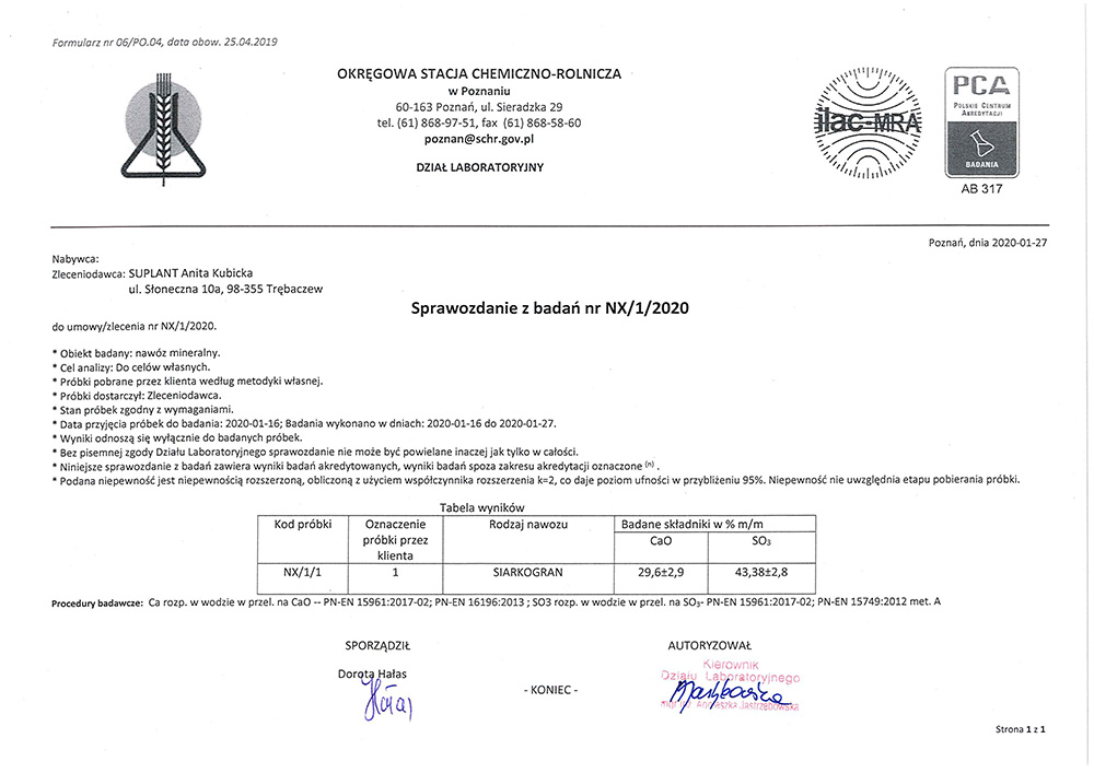 Siarkogran to nowoczesny nawóz w postaci siarczanu wapna. Jest źródłem siarki oraz wapnia, które są łatwo rozpuszczalne w wodzie.