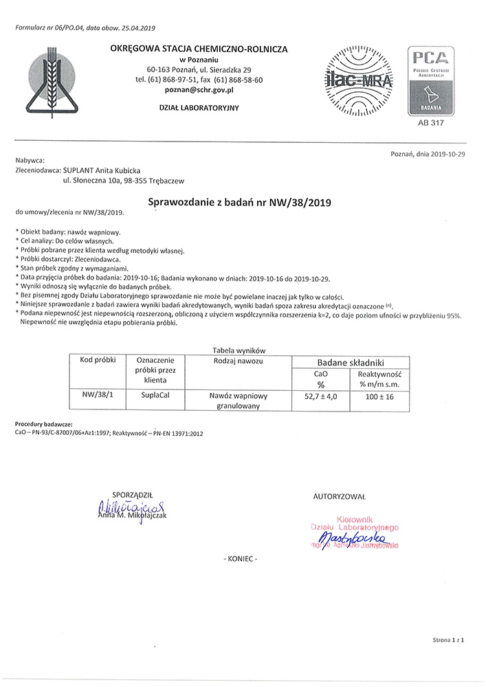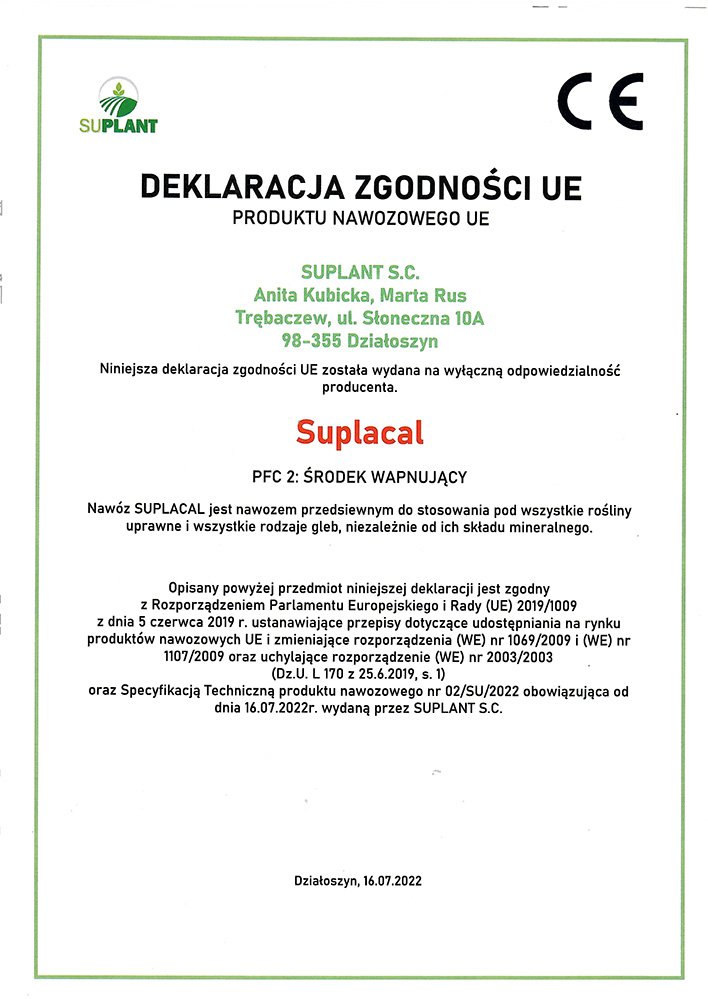 Suplacal – to nawóz najnowszej generacji. Produkowany jest na bazie mączki kredowej pochodzącej ze złoża Jury Krakowsko - Częstochowskiej.