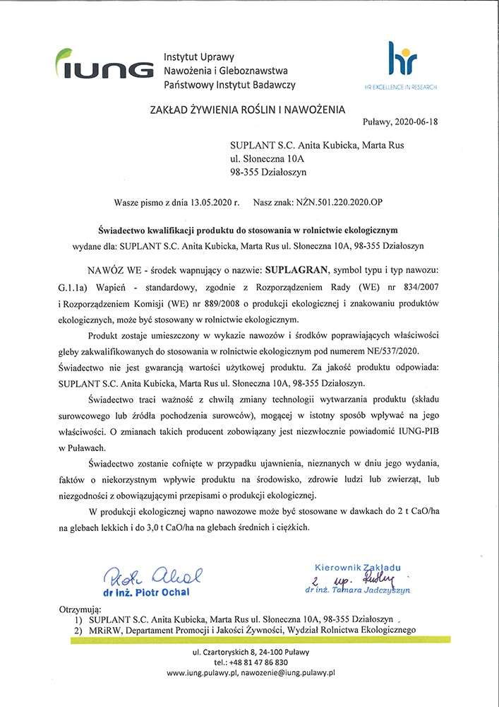 Zaawansowana technologicznie granula o równym uziarnieniu, gwarantuje przemyślane i optymalne uwalnianie wapna w glebie, idealnie z zapotrzebowaniem. Zastosowanie nawozu SUPLAGRAN w formie granulatu pozwala w miarowych odstępach czasu odżywić roślinę w niezbędny wapń, co przyczynia się do wydatnego wzrostu plonu. Wyniki badań wykazały, że stosowanie nawozu wapniowego przyczynia się do wzrostu plonów średnio nawet o 20-30%. Nawóz ten jest nośnikiem niezbędnego dla prawidłowego wzrostu roślin wapnia w najczystszej dostępnej postaci.